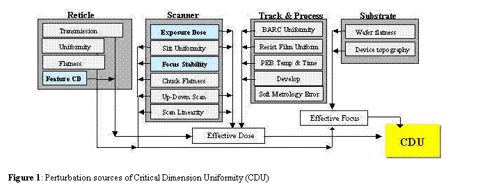 These needs present themselves in both the Wafer Fab and Mask Manufacturing components of the industry. The DFM Market need for Predictive Metrology A less well recognized opportunity lies in the Design for Manufacture market. This is a young market in which companies such as Brion and KLA-Tencor offer hardware based, enhanced simulation tools for feature design. These markets are driven by the need to properly simulate feature designs on photomask reticles incorporating Optical Proximity Correction (OPC) based structures. OPC structures are active lens elements on the reticle that allow the exposure tool to properly image features smaller than the wavelength of the light used in the imaging sequence. This imaging trick is achieved by having the critical feature actively modify the wavefront in its locality using advanced techniques such as localized phase-shifting of adjacent image-rays or controlled scattering to interfere and enhance the final image on the wafer. These masks are expensive because of the additional etch and alignment steps required for their construction. DFM simulators start with a reticle design and then introduce lens aberrations to determine the shape and characteristics of the final wafer image. Unlike classic simulations such as employed in Prolith from KLA-Tencor, these offerings contain hard-coded hardware in a custom-designed computer to calculate the images. Unlike Prolith, the speed of the hardware-based simulators allows many critical elements on the exposure field to be simultaneously calculated for improved accuracy and scope. Also unlike Prolith, for the first time it is now very important for these simulators to be “calibrated” to the target wafer process. The calibration consists of a simplified process window calculation from basic feature-width metrology to set the proper variables for focus, dose and size of the process window. One of the offerings will soon be adding in a simplified set of customer-specific lens aberrations to generically calibrate to the type of exposure tool used in the target customer facility. In summary, these simulators are used in the final design of the photomask to optimize the phase and scatter-bar construction shapes of the OPC structures on the reticle. An adjunct technology called “Inverse Lithography” has been introduced by Luminescent Technologies. Luminescent again uses a hardware-accelerated simulation tool but now the final image on the wafer is the starting point. Quite naturally, this final image looks like the chip-design structure for the integrated circuit. The Inverse Lithography analysis then introduces a set of optical aberrations to inversely calculate a binary image on the photomask. Unlike classic OPC structures, the photomask does not require additional etching and alignment steps in its manufacture. However these new reticle-designs do not generate the easily produced rectangular shapes generated by most photomask production tools but can contain many feature elements of any size, shape and orientation. The mask sets therefore are very complex and expensive. The two advanced OPC tools just described are “calibrated” to a focus-dose matrix of critical linewidths that is measured and passed into a process window calculation. The metrology and analyses are basic and easily performed with today’s equipment. This simulation technology however is in its infancy and is focused on product in the 90 nm node and above. These calibration techniques will not provide the accuracy needed to support the next generation of device. The images generated during semiconductor production contain four major sources of systematic error shown in figure 1. These four sources contribute a total of seventeen systematic signatures that can be tuned and controlled to optimize a photolithography cell during manufacturing. Of these seventeen variables, the OPC simulators today consider only two; focus and dose. The remaining variables introduce significant errors into the simulation that will become more and more significant as these products mature and the industry drops to device nodes of 45 nm and smaller feature size.