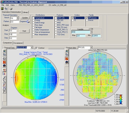 LithoWorks PEB is the only software capable of importing both thermal-sensor and critical feature metrology. Align and correlate individual features or derived variants such as rise-time, energy delivered and thermal flow to CD, Side-wall-angle, film thickness, etc.